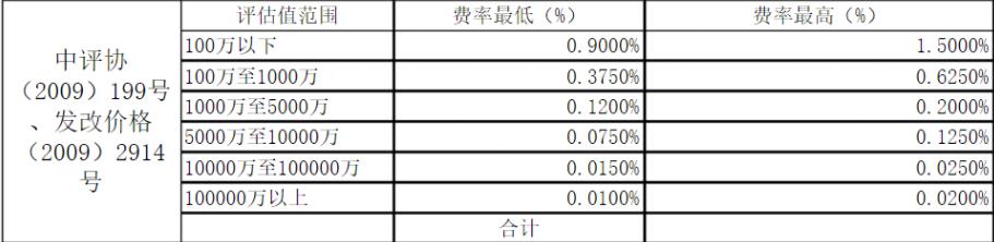 目前资产评估执行的行业收费标准是发改委颁布的《资产评估收费管理办法》,资产评估收费采用差额定率累进收费办法,分档计算收费额,各档相加为收费总额。
